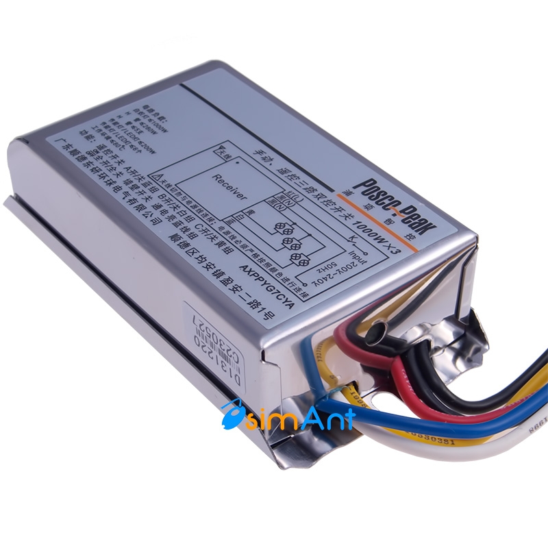 Система дистанционного управления светом с тремя независимыми каналами. Входящее напряжение приёмника составляет от 200В до 240В. Рассчитан на сеть переменного тока с частотой 50 Гц. К каждому каналу можно подключать нагрузку с мощностью до 1000 Вт. Максимальная мощность ламп накаливания может составлять до 800 Вт, энергосберегающих ламп - 300 Вт, светодиодных фонарей - 500 Вт и галогенных ламп - 300 Вт. Корпус пульта ДУ и приёмника изготовлен из АБС-пластика, благодаря чему устройство имеет хорошую механическую прочность, надёжность, стойкость к агрессивной химической среде, повышенной влажности воздуха, а также защиту при прямом воздействия температуры до 100ºС. Применение качественных электронных компонентов позволяет добиться дальности действия радиосигнала на расстояние до 50 метров на открытой местности и до 20 метров внутри помещений (может передавать сигнал сквозь стены). Каждая подобная система имеет индивидуальную кодировку радиосигнала, что дает возможность использовать несколько систем одновременно без потери качества их работы. При необходимости систему можно включать не только посредством пульта ДУ, но и стационарным включателем. Также есть в наличии другие системы управления светом.