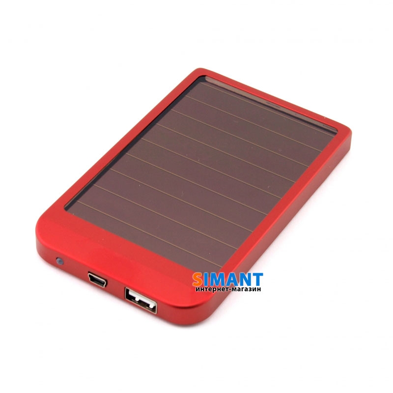 Зарядное устройство на солнечных батареях красного цвета + дополнительный внешний аккумулятор. Устройство может работать автономно находясь в пределах любого источника света, чем ярче - тем лучше, накапливая энергиную во встроенный аккумулятор. Встроенный аккумулятор 2600 мАч, что намного больше, чем у любого мобильного телефона. Устройство имеет два разъема USB и Mini USB. Последний служит для быстрой зарядки сетевым адаптером. Внешний аккумулятор для телефона будет полезен тем, кто ходит в походы или много времени в пути, где не всегда доступна розетка.