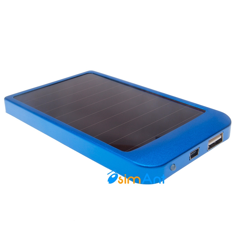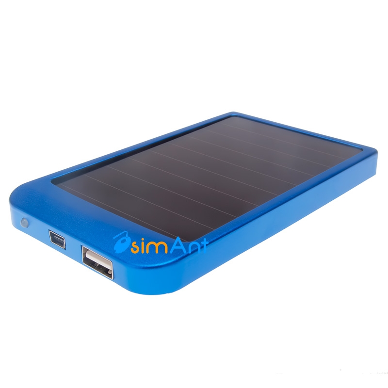 Зарядное устройство на солнечных батареях синего цвета + дополнительный внешний аккумулятор. Устройство может работать автономно находясь в пределах любого источника света, чем ярче - тем лучше, накапливая энергиную во встроенный аккумулятор. Встроенный аккумулятор 2600 мАч, что намного больше, чем у любого мобильного телефона. Устройство имеет два разъема USB и Mini USB. Последний служит для быстрой зарядки сетевым адаптером. Внешний аккумулятор для телефона будет полезен тем, кто ходит в походы или много времени в пути, где не всегда доступна розетка.